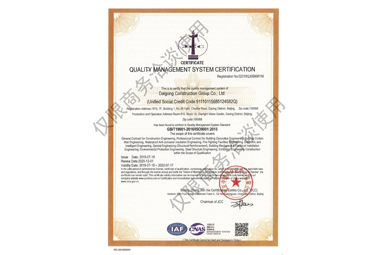 戴工建設集團有限公司,創建于2009年,注冊資本9888萬元人民幣。公司位于北京市大興區。具有建委頒發(fā)的建筑裝飾裝修專業壹級,防水保溫工程專業壹級,建筑幕墻專業貳級,消防設施專業貳級,電子與智能化專業貳級,特種工程(結構補強)專業不分等級,建筑機電安裝專業貳級,環(huán)保工程專業貳級,鋼結構專業貳級,建筑工程總承包貳級,建筑裝飾工程設計專項甲級,展覽陳列工程設計與施工壹級,展覽展示工程壹級...更多>>